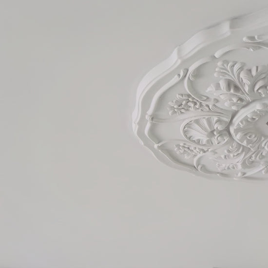 Denne loftsroset er en udtryksfuld loftsstukkatur med rig ornamentik og udformede detaljer. Formsproget er inspireret af forrige århundredeskifte og giver rosetten en tydelig historisk karakter med en følelse af håndværk og arkitektonisk tradition.